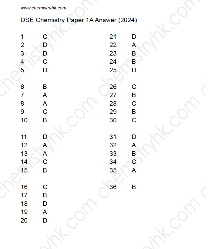 2024 DSE Chemistry Past Paper 1A MC Answer
